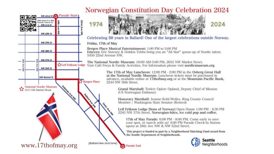SEATTLE - The streets of Ballard are adorned with Norwegian flags and filled with the sounds of celebration Friday as the community comes together to mark Syttende Mai, Norway’s Constitution Day.