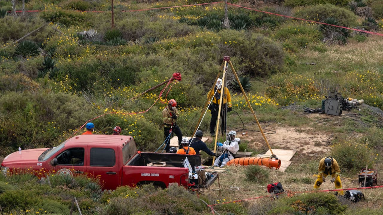 A rescue worker descends into a waterhole where human remains were found near La Bocana Beach, Santo Tomas delegation, in Ensenada, Baja California State, Mexico, on May 3, 2024. . The FBI said on Friday that three bodies were found in Mexico's Baja