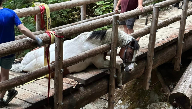 NORTH BEND, Wash. - Over 30 rescuers worked together to free a horse that got stuck in a rotted bridge on the Middle Fork trail in North Bend over the weekend.