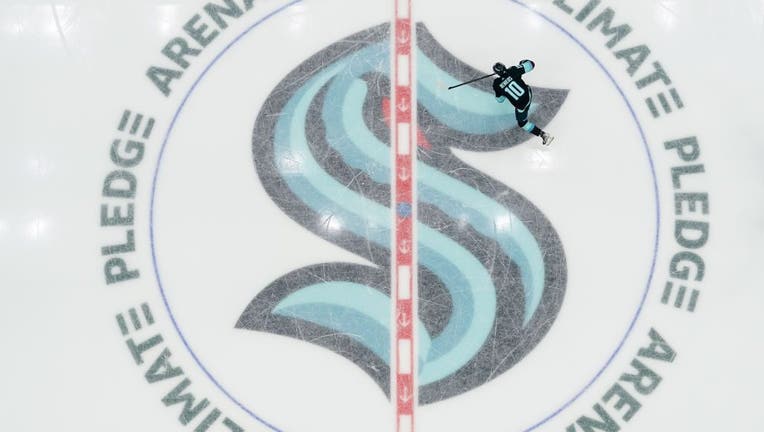 SEATTLE, WASHINGTON - MARCH 18: Matty Beniers #10 of the Seattle Kraken skates at center ice during the first period of a game against the Edmonton Oilers at Climate Pledge Arena on March 18, 2023 in Seattle, Washington. (Christopher Mast / NHLI / Getty Images)