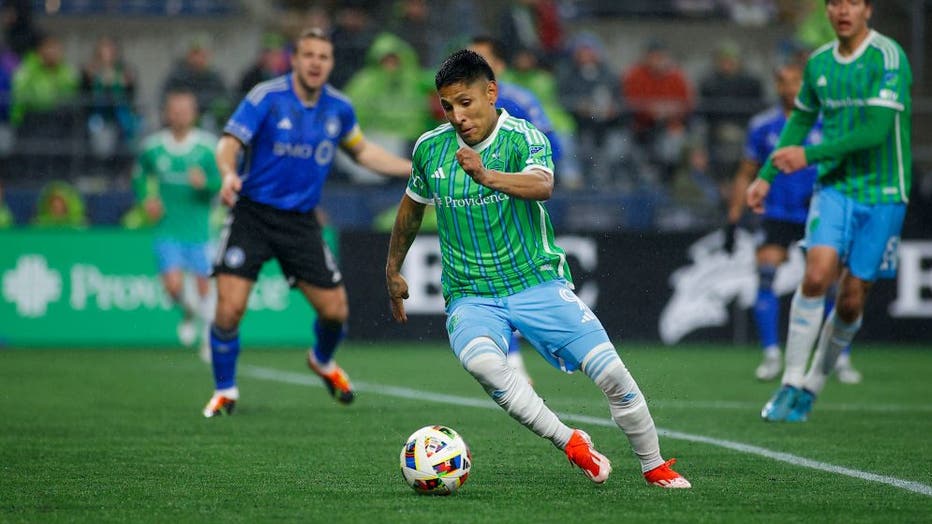 SEATTLE, WA - APRIL 06: Seattle Sounders forward Raúl Ruidíaz (9) with the ball during a MLS matchup between CF Montréal and the Seattle Sounders on April 6, 2024 at Lumen Field in Seattle, WA. (Oliver McKenna / Icon Sportswire / Getty Images)