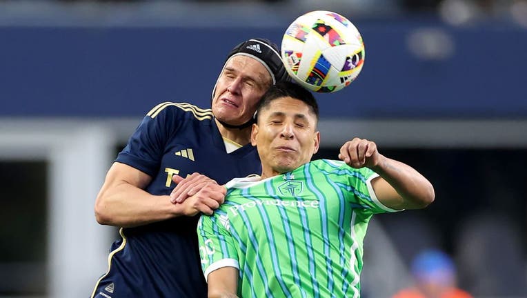 SEATTLE, WASHINGTON - APRIL 20: Bjørn Inge Utvik #15 of Vancouver Whitecaps and Raúl Ruidíaz #9 of Seattle Sounders head the ball during the first half at Lumen Field on April 20, 2024 in Seattle, Washington. (Steph Chambers / Getty Images)