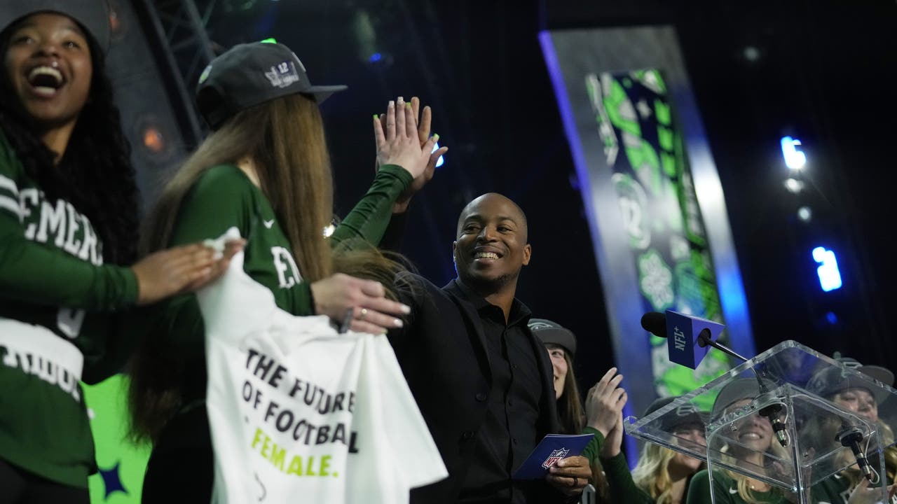 Seattle Seahawks wide receiver Tyler Lockett, center, stands on stage with Seattle's Emerald Ridge girls flag football team during the third round of the NFL football draft, Friday, April 26, 2024, in Detroit. (Jeff Roberson / Associated Press)