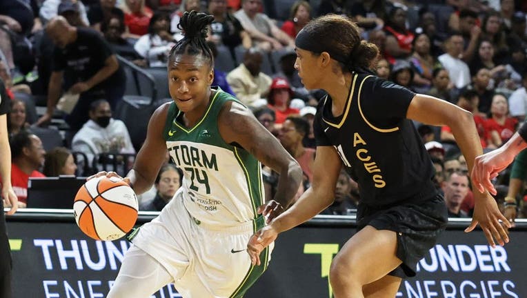 LAS VEGAS, NEVADA - SEPTEMBER 02: Jewell Loyd #24 of the Seattle Storm drives against Sydney Colson #51 of the Las Vegas Aces in the first quarter of their game at Michelob ULTRA Arena on September 02, 2023 in Las Vegas, Nevada. The Aces defeated the (Ethan Miller / Getty Images)